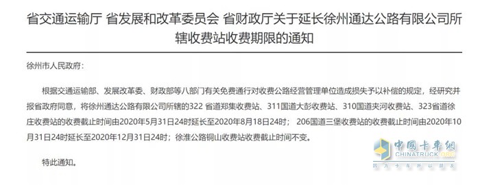 江苏省交通厅、江苏省发展和改革委员会、江苏省财政厅近日联合发布文件《关于延长徐州通达公路有限公司所辖收费站收费期限的通知》,将徐州通达公路有限公司所辖的322省道郑集收费站、311国道大彭收费站、310国道夹河收费站、323省道徐庄收费站的收费截止时间由2020年5月31日24时延长至2020年8月18日24时。