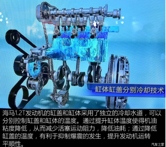 海马1.2T发动机采用了涡轮增压、缸内直喷、双VVT等目前主流小排量涡轮增压发动机上常见的成熟配置,增加了中国品牌厂商自主研发产品中较为少见的集成式排气歧管,技术上向合资品牌靠拢,进一步优化燃烧效率以及提升热效率。虽然目前海马还未公布这款发动机的详细动力参数,但预计这款发动机的最大功率约为80千瓦,峰值扭矩约为200牛·米,与目前市场上的主流1.2T发动机产品在性能上持平以保持足够的竞争力。