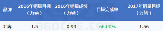 北奔2016年的销量目标为1.5万辆,其实际销量为0.99万,目标达成率仅有66%,只能算是刚刚及格。