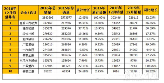 2016年12月份,柴油机市场销量前十企业较去年同期仅一汽集团一家企业微降0.94%,增幅超50%的企业达到6家(含广西玉柴(+49.06%)),中国重汽增幅甚至超过100%,达到110.95%。另外几家增幅超过50%的企业分别是潍柴控股(+60.59%)、东风汽车股份(+60.37%)和安徽江淮(+70.82%)。此外,云内动力2016年12月份增幅继续超过50%,达到56.85%,但第一商用车网此前曾分析过,云内动力上报给中汽协的销量数据包括车用和非车用发动机,因此不具备车用柴油机领域的参考意义。