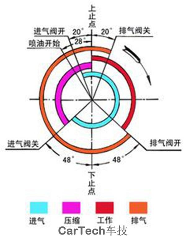 来看看四冲程汽油发动机的进排气门配气角分配就明白了,虽然四个冲程进气-压缩-工作-排气各占据了1/4的行程,但进排气阀门的打开关闭时机却并不是正对进气排气冲程介绍开始的时机的,为了达到更好的“换气”效果,通常排气阀门和进气阀门会提前打开,延迟关闭,这样在汽缸换气时就可以利用气流的惯性形成“扫气”效应。通常不带VVT的发动机排气阀门会提前48度打开,延迟20度关闭。