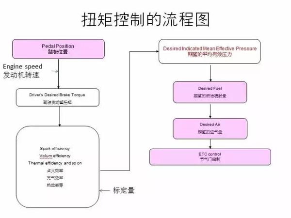 下面说点高级的。近些年市面上销售的汽油车里,除了部分低端车型,大部分采用的都是电子节气门,带增压器的车更是百分之百的电子节气门。采用ETC(电子节气门)的好处我就不多说了,这次我来简单说说电子节气门的发动机控制。一般来说,有ETC的发动机都采用扭矩模型控制。油门踏板和节气门阀片不是简单的对应关系,而是一张可标定的map图,简单称之为pedal to torque map。这张表可以做成各种形状来适应不同的车型。同一台发动机,调整这张表就可以调校出完全不同的特性。发动机ECU内部的简单计算流程是这样的: