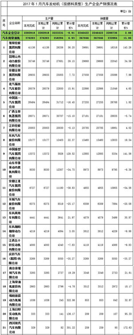 2017年1月份汽车用柴油机生产量共完成生产276203台,累计增长6.93%; 销量267046台,累计增长15.06%。销量排名前三的企业为潍柴控股集团有限公司、昆明云内动力股份有限公司、安徽全柴集团有限公司。