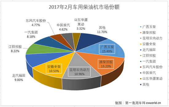 从累计销量来看,2017年1-2月的车用柴油机市场一片红火,销量前十企业均是高奏凯歌,增幅较高的玉柴、潍柴和重汽三家企业累计增幅均超过100%;增幅最低的安徽全柴,也增长了8.93%。