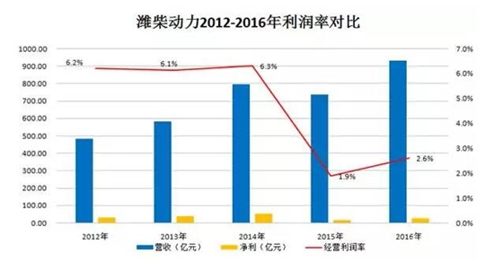 2012-2016年间,潍柴的营收一路狂涨,其2016年的营收几乎比2012年时多了一倍;但其2016年净利却低于2012年,且不到2014年净利的一半。
