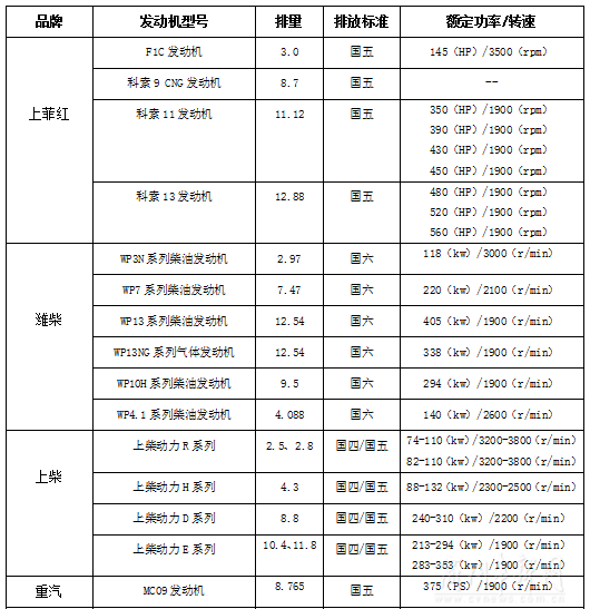 中轻卡及皮卡方面,福田欧马可、四川现代盛图搭载的是康明斯发动机;江淮汽车帅铃H、骏铃V6搭载的是迈斯福发动机,康铃K5、帅铃X、帅铃T6搭载的是江淮动力发动机;庆铃的KV600、700P、TF皮卡搭载的均为五十铃发动机;重汽统帅G3W搭载的是曼技术发动机MC05;上汽C300-33冷运概念车搭载的是上柴发动机;上汽大通T60皮卡搭载的是上柴VM发动机。