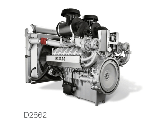 曼恩D2862四冲程燃油直喷式柴油发动机采用EDC7控制单元带发动机电脑,共轨喷射系统的喷射压力达1600巴,配置涡轮增压及增压空气中冷,如用户要求监控系统还可提供操作面板。
