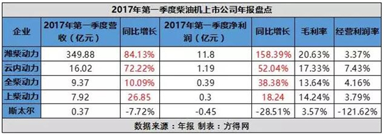 据方得网统计,2017年第一季度,在5家柴油机上市公司中,有4家营收和净利润实现了正增长,潍柴动力以349.88亿元的营收和11.8亿元的净利润居首位。