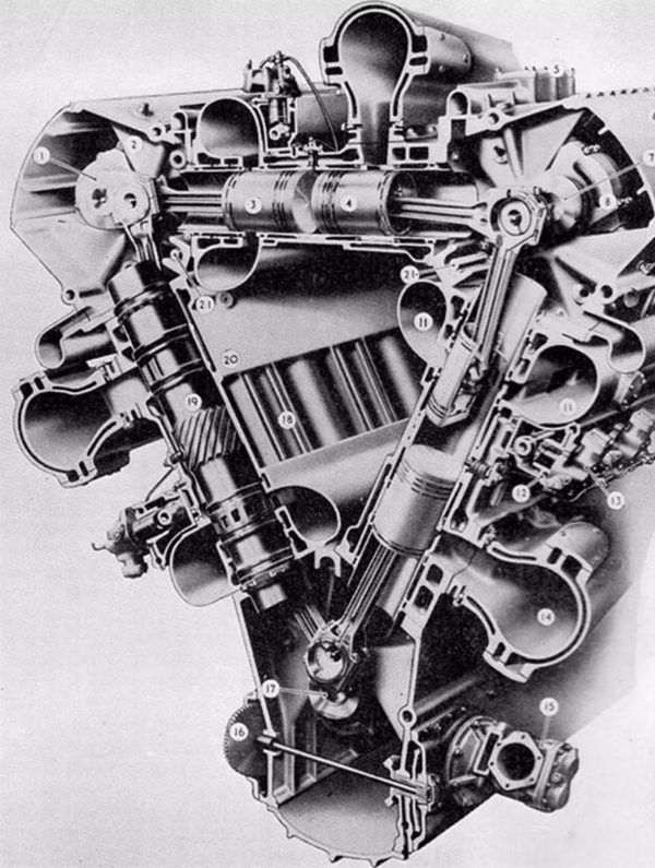 这是一款三角形的18缸对置活塞式二冲程增压柴油机——是的,又是两冲程柴油机!从结构上看,这是一台三角形结构的Commer TS3,其两冲程原理也和Commer TS3一模一样,只是气缸数更多而已,相当于在三角形结构中安置了三套六活塞冲程。这台三角形发动机与内部涡轮增压器最大能产生4177kW的功率。但遗憾的是,它从来没有被用在一辆汽车上。