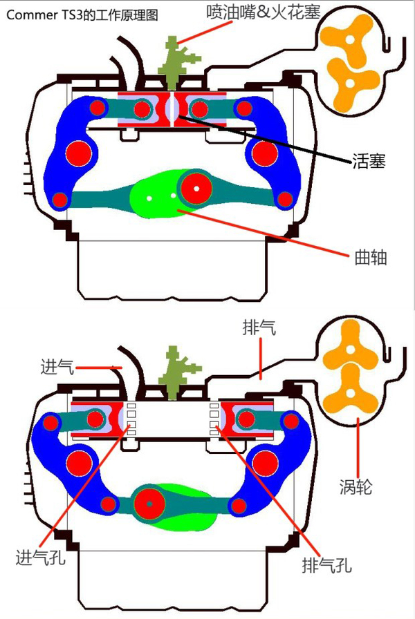 因为对于柴油机而言,必须四个冲程才能满足基本工况需求。实际上这种发动机每个汽缸配有两个对向的活塞,而且没有汽缸盖,两个活塞各走两个冲程,实际上就完成了四个冲程,对向活塞轮流压燃,一边气缸压燃之后对向气缸就同时完成压缩,同时完成排气和进气……但特殊的是,TS3发动机只有3个汽缸和一个曲轴——其实你可以将这款发动机视为是水平对置6缸柴油机。