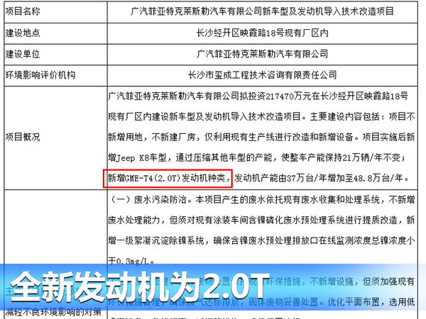 广汽菲亚特克莱斯勒发动机导入技术改造项目已经启动。网上车市从湖南省环保局获悉,该项目将新增代号为GME-T4的2.0T发动机。目前广汽菲克长沙工厂已投产1.4L-2.4L排量不等的多款发动机,年产能为37万台。新发动机项目建成后,广汽菲亚特克莱斯勒国产发动机年产能将由37万台/年增加至48.8万台/年。