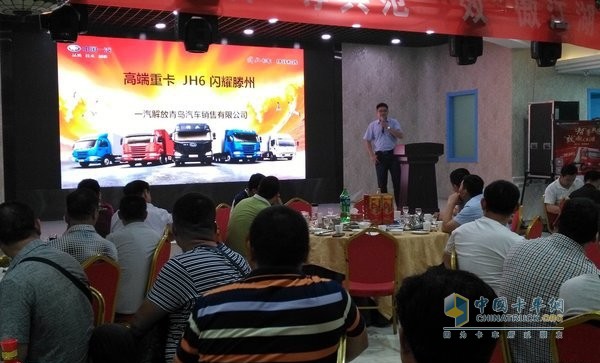 一汽青岛解放山东大区经理彭玉全先生就一汽青岛解放的企业概况、天V产品、JH6产品、服务网络、配件网络等做了一系列的介绍,并且就JH6产品的先进技术进行了详细的介绍: