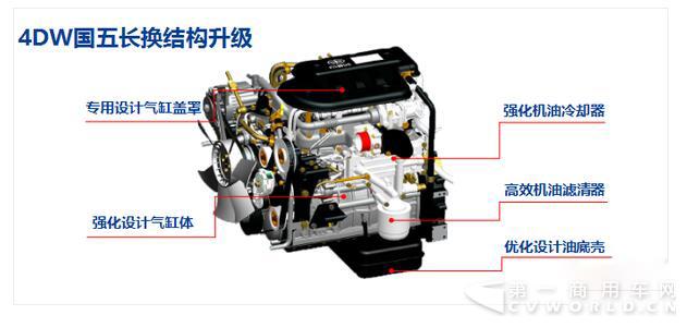康威4DW-E5平台通过结构优化升级,提高了发动机冷却能力,降低机油工作温度,从而延长了机油使用寿命。同时更高效的机油滤清器配合锡柴指定的CJ-4牌号及以上机油,最终实现了4万公里超长换油周期。