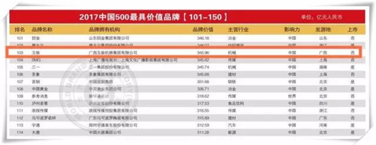 6月22日,世界品牌实验室(World Brand Lab)在北京发布了2017年《中国500最具价值品牌》榜单,玉柴荣登中国500最具价值品牌第103位,品牌价值由2016年的281.95亿元跃升为345.96亿元,首次突破300亿元。