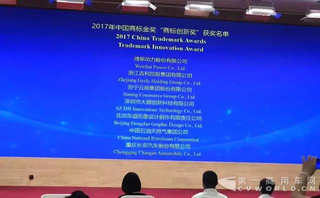 6月30日上午,2017年“中国商标金奖”颁奖大会在江苏扬州召开。潍柴动力从众多知名企业中脱颖而出,荣获“中国商标金奖·商标创新奖”,并在7家“商标创新奖”获奖单位中名列第一位,是目前山东省唯一获该奖项的装备制造类企业,也是国内内燃机行业第一家获奖企业。