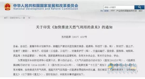 2017年7月4日,国家发改委官方网站发布了由发改委、交通运输部、工信部等13个部委联合制定的《加快推进天然气利用的意见》。《意见》指出,加快天然气车船发展。天然气汽车重点发展公交出租、长途重卡,以及环卫、场区、港区、景点等作业和摆渡车辆等。在京津冀等大气污染防治重点地区加快推广重型天然气(LNG)汽车代替重型柴油车。