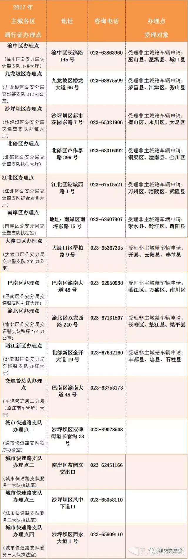 ①2017年度通行证办理点安排:换发红色、黄色通行证的货车,注册登记地为主城区的,请到注册地所属的交巡警支队办理;