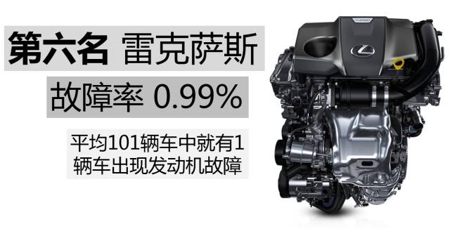 雷克萨斯只排第六!不过刚好是个分水岭,发动机故障率在1%以内,据该公司的数据,雷克萨斯旗下的车型发动机故障率都控制的比较好。
