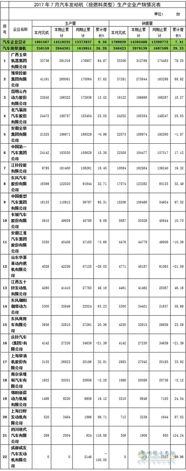 2017年7月份汽车用柴油机生产量共完成生产250159台,累计增长26.2%; 销量240423台,累计增长29.33%。销量排名前三的企业为潍柴控股集团有限公司、广西玉柴机器集团有限公司、北汽福田汽车股份有限公司。