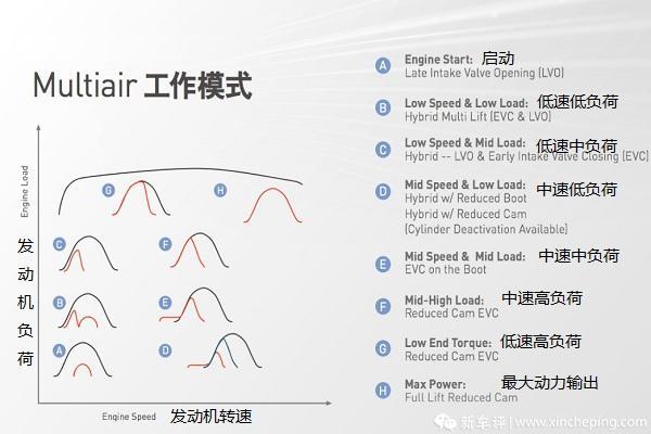 通过上图我们可以看到MultiAir模块控制的不同工况下的进气门开闭策略,黑色的线为标准的气门开启曲线,红线和蓝线为使用MultiAir技术后的开启曲线,曲线X方向表示开启时间,Y方向表示开启大小,坐标轴表示的是发动机的工况。可以看到在B低速低负荷的时候,进气门实现了2次开启,而在D中速低负荷和E中速中负荷的时候,都可实现气门提前开启,此时进排气门同时开启的时间增长,一部分废气残留在缸体内进行二次燃烧,可以减少氮氧化物排放。同时在D中速低负荷的时候还提供了两种进气模式(红线和蓝线)。