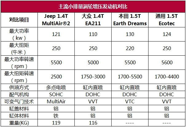 JEEP的这台1.4T发动机使用了业内比较先进的MultiAir技术,实现了进气门正时和升程连续可调,动力性能达到业内领先水平,但是其仍有很多业内常见的发动机技术未加以应用,导致油耗水平仍落后于竞争对手。