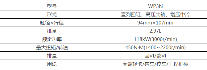 WP3N是潍柴近期推出的一款轻型柴油机,B10寿命长达80万km。缸径94mm,行程107mm,排量2.97L。采用单缸四气门设计,功率覆盖130~160PS,最大扭矩可达380~450N·m,满足国五、欧六排放标准。这款发动机采用了潍柴自主ECU、集成控制,精准高压喷射,充分雾化。并可更换纸质机油滤芯,常用保养件无金属。同时,发动机机油滤清、机油冷却、单向阀、机油节温器、水泵集成在机油滤清器模块,机油泵内外转子、主油道限压阀、发动机前端盖集成在油泵模块,集成化程度更高、体积更小。同时,这款发动机还配备了潍柴EVB制动系统,固定在缸盖顶部,可大幅提高制动效率。