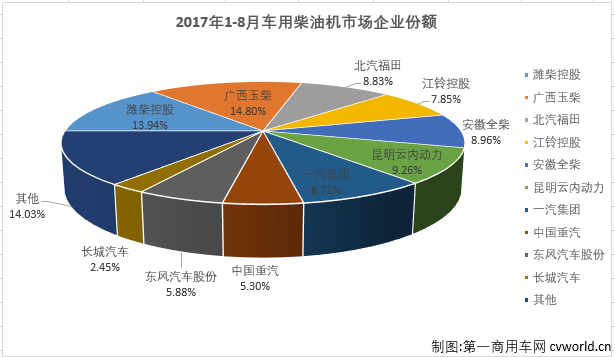从累计销量来看,2017年1-8月国内车用柴油机市场一片红火,累计增长29.00%,今年前8月比去年同期多销售526989台。前十企业仅有安徽全柴遭遇下滑,累计下降了2.94%;增幅最高的重汽和玉柴两家企业累计增幅分别达到了101.91%和78.50%,潍柴的累计增幅也达到74.99%。实现增长的9家企业增幅全部达到两位数。
