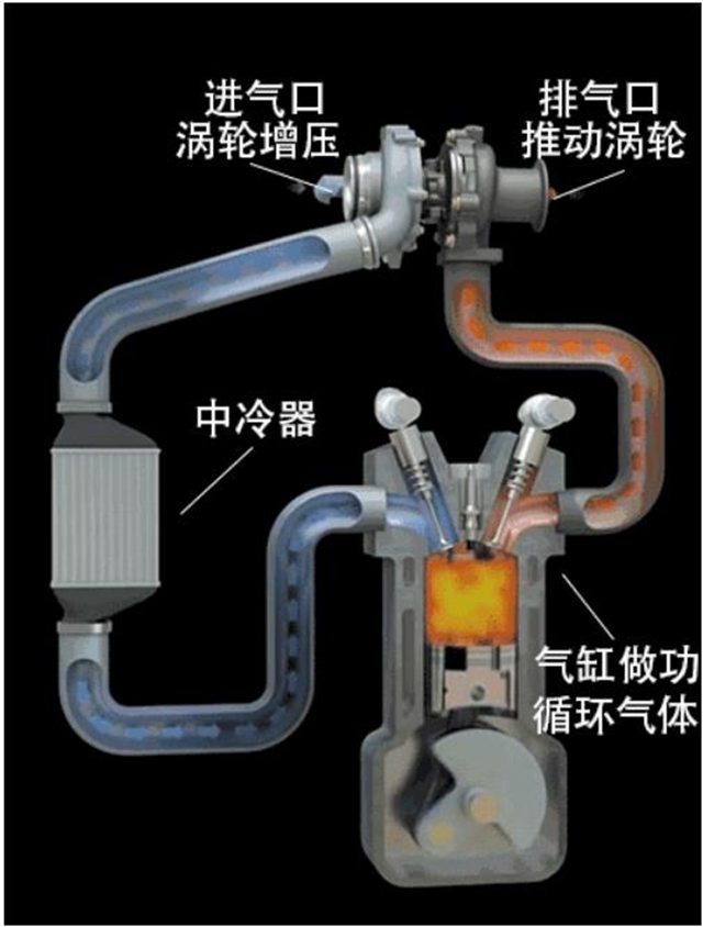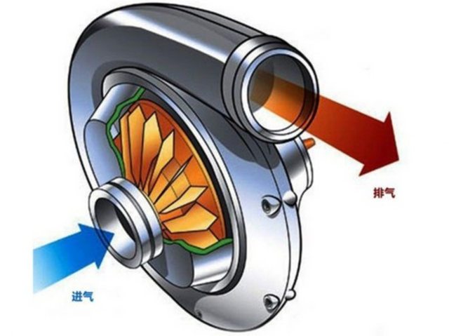 废气涡轮增压的动力来源是燃烧产生的废气,它有两个类似于风扇叶片的部件,叫做涡轮和叶轮。涡轮装在排气道内,叶轮装在进气道内,涡轮和叶轮靠一根轴连在一起,会同时旋转。涡轮堵在了排气道内,所以废气需要推开涡轮才能排出去,废气时时刻刻都在推动涡轮,涡轮在里面就会转动起来。涡轮转动了,带动同轴的叶轮也开始旋转。因为叶轮是安装在进气道内的,所以就会对空气进行压缩。