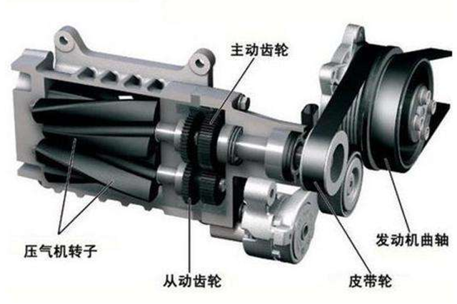 机械增压和涡轮增压的原理是一样的,不同的是它们的动力来源。机械增压的动力直接来自于曲轴旋转,像安装发电机等其他附件一样,它是用皮带直接与曲轴皮带轮相连,靠皮带带动旋转的。一个大轮带动小轮旋转,所以在低转速下便可获得增压,一般超过1000转便会有增压效果,并延续至引擎最高转速。增压的动力输出也与曲轴转速成一定的比例,随转速的提高而增强,整体增压曲线是呈现一缓步上升的平滑曲线,没有迟滞,也很线性。
