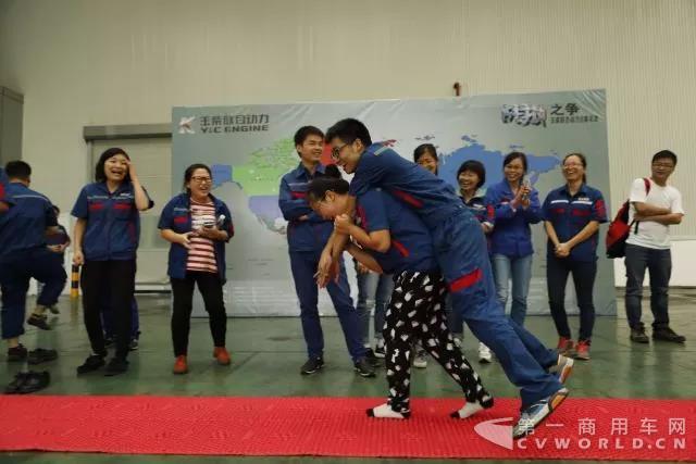 “战狼”之争空前火热,迎来了20支队伍报名参赛。队员赤脚以接力的形式为“6K抢夺市场”,即在指压板上完成规定的动作,分别是运乒乓球、跳绳、俯卧撑、踢毽子及背人,5分钟内完成规定的动作可获得6K勋章,获得6K勋章最多的团队获胜。有的参赛队员一踏上指压板就尖叫连连,有的参赛人员忍得满脸通红。在最后背人环节,参赛女生爆发“洪荒之力”,背着男生向着终点冲去。现场掌声、呐喊声、笑声连连。经过激烈的比拼,技术中心1队、技术中心2队、采购部1队摘得前三名。