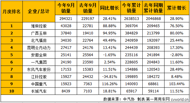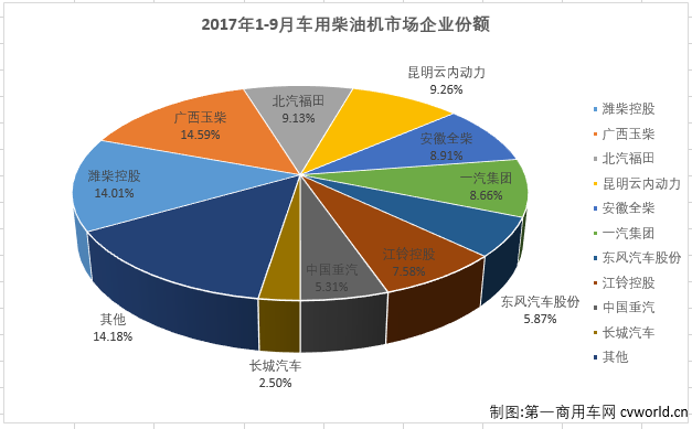 根据中汽协最新产销快讯,2017年9月,国内车用柴油机市场销售294321台,同比增长28.41%,增幅较上月(+26.45%)有所扩大,环比8月增长11.04%。9月份车用柴油机市场持续表现良好,这个从2016年四季度开始的良好态势还在继续。其主要驱动力,源于国内重卡市场治超新政所带来的火爆销售形势(今年前9个月,重卡市场的月销量均超过了8万辆,刚过去的9月份又强势销售了超10万辆,达到101110辆)。与此同时,国内轻卡行业整体表现也不错,9月份,轻卡市场销售14.92万辆,同比增长18.79%,今年1-9月累计增长10.65%。增幅虽较重卡市场小了很多,但市场体量大,因此也为柴油发动机市场贡献了不少增量。