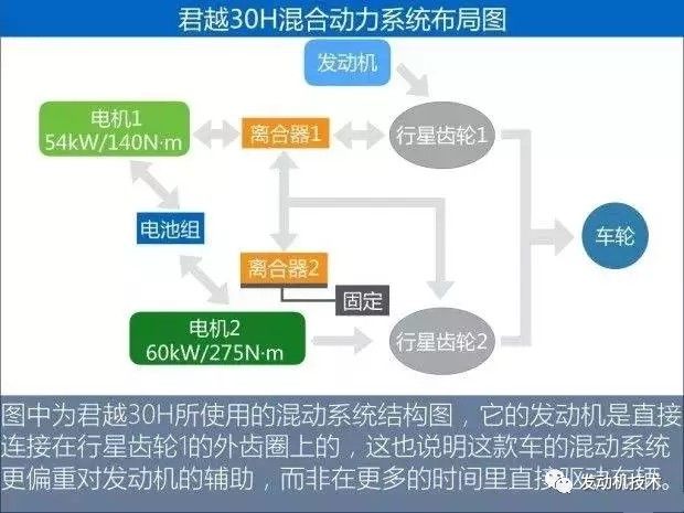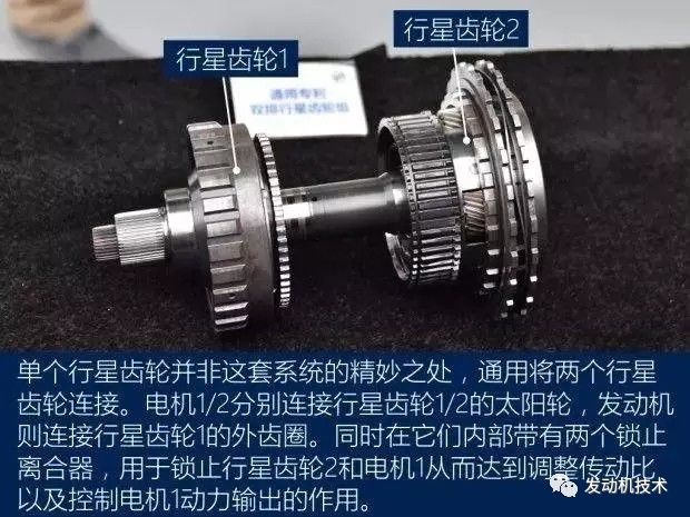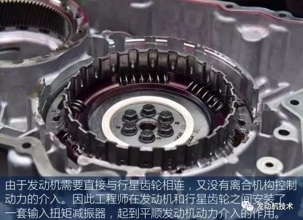 从这个示意图可以看到,发动机、电动机、离合器、行星齿轮组以及电池等部件的连接关系,发动机直接与行星齿轮组1的外齿圈相连,为了获得平顺的动力输出,在它们之间设有一套输入扭矩减振器,与自动变速箱液力变矩器的减振结构类似。电机1和电机2分别连接在行星齿轮1/2的太阳轮上,这套系统输出轴都在行星架上。离合器2一端固定,一端与行星齿轮2连接,通过同时锁止两个离合器可以实现固定齿比的行驶模式。