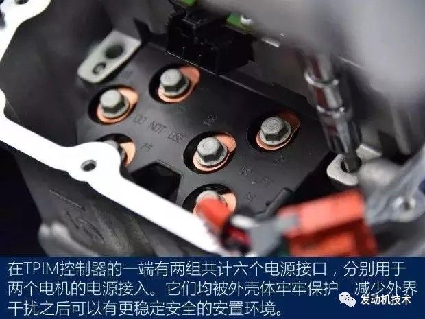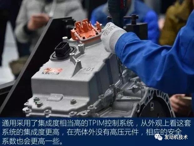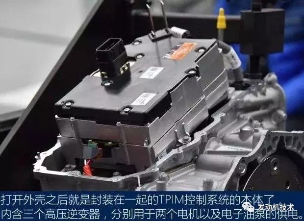 言归正传,先回到位于这套电驱系统正上方的电控系统上。这套名为TPIM的电控系统将高压逆变模块集成在了壳体内部,与丰田在用的THS混动系统相比集成度更高,安全系数也高一些。
