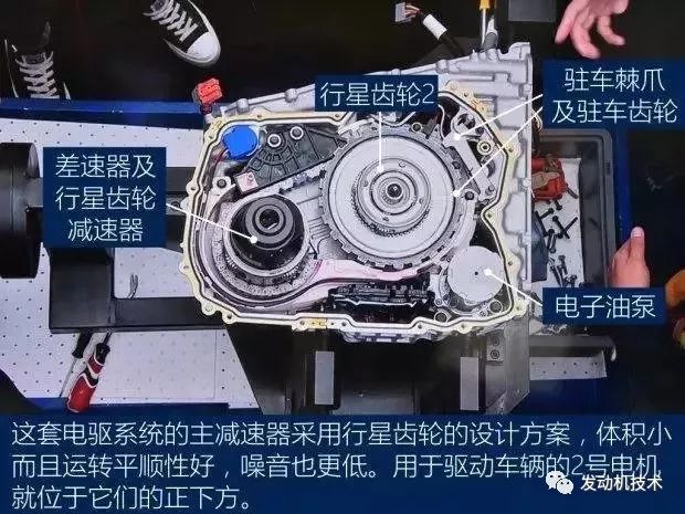 在2号电机下方可以看到第二组行星齿轮,通用在这套电驱系统上采用了双排行星齿轮的设计,与丰田THS混合动力系统所采用的单行星齿轮设计相比虽然在结构上更为复杂,不过电动机的特性是高转速区间扭矩衰减严重,因此丰田THS混合动力系统为了提高中高车速下的扭矩输出,采用的是电动机-主减速器-行星齿轮的动力分配方案。通过单行星齿轮负责调配两个电机和发动机必然存在一些局限性,这时双排行星齿轮的优势就得以体现了,它具有更为宽泛的传动比调节范围可以使得发动机在更广的速度区间内都处于经济工作状态,并且获得更为多样的传动模式以适应更多的驾驶状态,从而达到优化动力节省燃油的目的。
