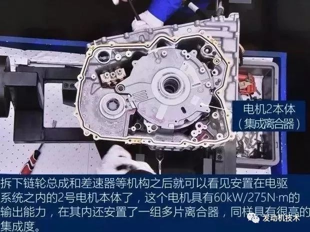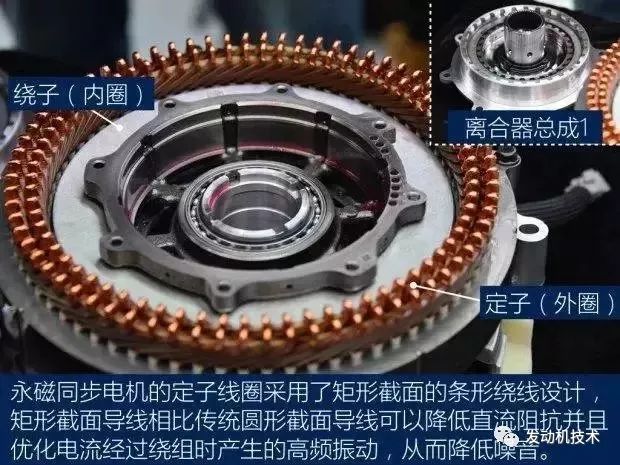 继续往下拆解就可以看到2号电机了,这个电机在低速情况如起步、倒车等情况下将会独立驱动车辆,它是一台永磁同步电机,具有60kW/275N·m的动力输出能力。在技术方面,它的定子绕线采用了矩形截面的导线,相比传统圆形截面的导线具有更低的阻抗,同时还能在工作时优化绕组的高频振动,达到降低电机噪音的目的。
