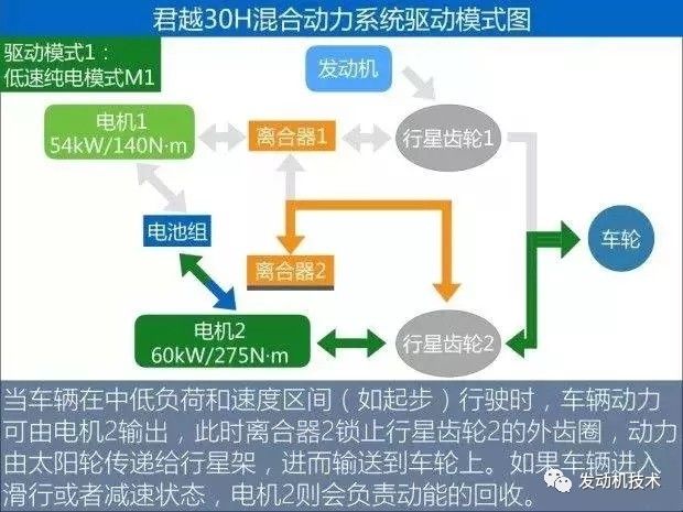 简单来讲,搭载了双电机与双行星齿轮的电驱系统有一种纯电动驱动模式和良种发动机+电机混合驱动的工作模式。其中纯电动驱动模式主要应用于低速和中低负荷的行车状态上,如日常起步以及倒车这样的用车场景。