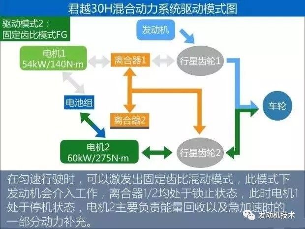 当起步之后车辆进入匀速行驶状态,这套电驱系统会进入固定齿比的混和动力驱动模式。在此模式下,离合器1和离合器2均处于锁止状态。电机1不介入工作,行星齿轮1的太阳轮锁止,行星齿轮2的外齿圈也处于锁止状态,发动机和电机2的动力经由两个行星齿轮的行星架输出。需要回收动力时,同样由电机2进行能量回收。