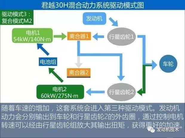 随着车速的增加,当车辆需要更多动力加速时,第三种模式便被激活了。此时发动机的动力会经由两组行星齿轮被分割,一部分用于直接驱动车轮。另一部分则进入电机2转化为电能驱动电机1,这时行星齿轮1就有了第二股从太阳轮输入的动力,这股动力与从外齿圈输入的发动机动力合成后从行星齿轮1的行星架输出驱动车轮。需要回收动力时,则同样通过电机2进行能量回收。在日常行车过程中,控制系统会根据需要在固定齿比模式和复合模式之间快速切换,根据实际工况选择合适的驱动模式。