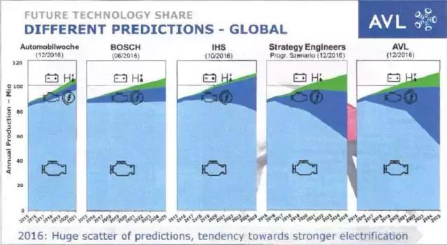 国际能源署IEA在2016年的预测:到2050年,有49%的车辆使用内燃机混合动力,58%的车辆使用内燃机动力。得出类似结论的还有Automobilwoche(欧洲汽车周报)、BOSCH(博世)、IHS、Strategy Engineers和AVL等等国际上有名的调研机构。
