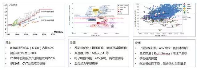 例如日本,他们在不断提高内燃机的热效率,马自达通过HCCI(均质稀薄压燃技术)把内燃机的热效率提高到48%,到2020年,这个数字极有可能突破50%;再例如美国的企业,他们已经从原来的大排量自吸变成现在的增压直喷发动机,搭配多挡位的AT变速箱,美国车和油老虎再也画不上等号;欧洲就更为激进,不仅采用了48V微混系统,还有RightSizing(合适排量发动机)、多挡变速器等等。
