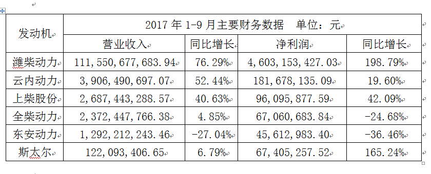 2017年前三季度,6家主要汽车发动机上市公司业绩表现不一。借力商用车重卡市场的复苏,重型柴油机上市企业取得了不错的业绩,轻型机企业仍处在产品结构优化的关键时期。集团化发展的潍柴动力领跑市场。云内动力、全柴动力除继续拓展主营业务外,开始进军新产业。上柴则在天然气发动机市场突飞猛进,东安动力与斯太尔在发动机主营业务上仍面临较大的发展困境。