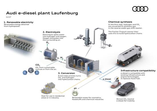下面显示了该燃料的产出过程:首先将水电解成氢气和氧气。氧气释放到空气中,而氢气与从大气中吸取的二氧化碳结合形成碳氢化合物。接着这些碳氢化合物被分离并产出合成柴油燃料,据奥迪称,这些燃料还可以用于食品、化妆品和化工。整个生产过程以水力发电产生的富余能量为基础,且制造过程中产生的热量可以被捕获并传送到家庭或企业。