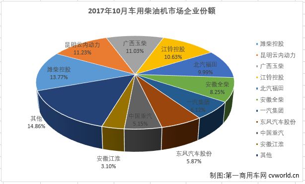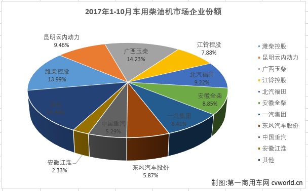 2017年10月,车用柴油机市场累计销量前十企业共销售247134台,合计份额达到85.14%。10月份,销量前十企业9增1降,仅有一汽集团一家企业遭遇下滑,降幅为24.94%;增幅最高的是广西玉柴(指玉柴集团),同比增长了67.74%。10月份,潍柴连续第五个月夺得月度销量冠军,云内动力超过玉柴569台升至月度销量榜第二位。