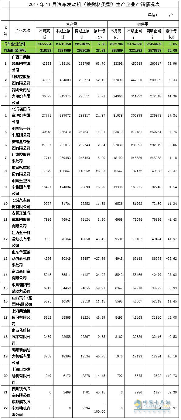 2017年11月份汽车用柴油机生产量共完成生产318223台,累计增长23.23%; 销量295889台,累计增长25.08%。销量排名前三的企业为潍柴控股集团有限公司、昆明云内动力股份有限公司、广西玉柴机械集团有限公司。