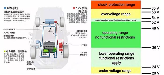 在2011年,奥迪,宝马,戴姆勒,保时捷,大众联合推出48V系统,来满足日益增长的汽车电器负载要求,更重要的是为了满足排放法规。至于为什么选择48V系统?60V是人体安全电压,48V电池的充电电压最高为56V,接近60V,所以48V电池眼压是安全电压下最高电压等级,而且科技总是以指数形式增长,使用相对高压为后来的技术铺垫好平台。
