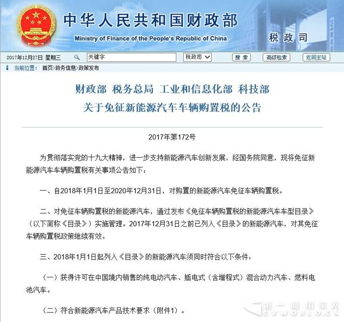 12月27日,财政部、税务总局、工业和信息化部、科技部发布“关于免征新能源汽车车辆购置税”的公告。公告显示,自2018年1月1日至2020年12月31日,对购置的新能源汽车免征车辆购置税。