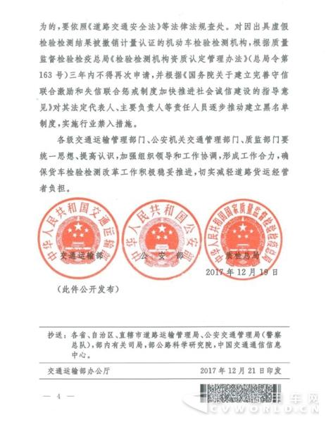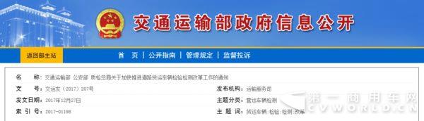 12月27日,交通运输部、公安部、国家质检总局联合召开电视电话会,通报《关于加快推进道路货运车辆检验检测改革工作的通知》(简称《通知》),部署道路货运车辆检验检测改革工作。