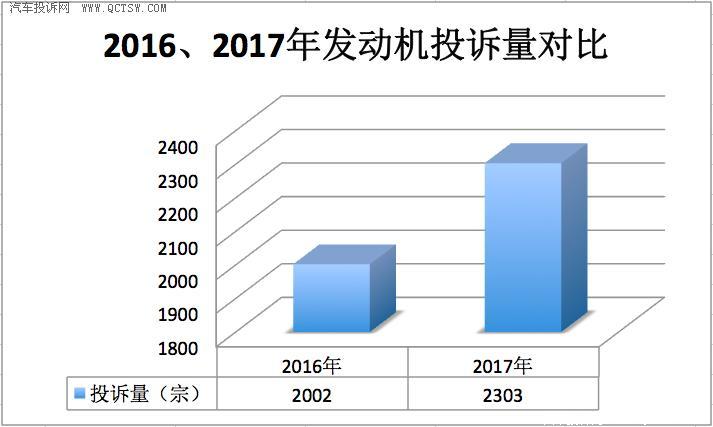 首先看看上图这组数据,在汽车投诉网上,2016年关于汽车发动机的投诉有2002宗,而在2017年则有2303宗。同比增加了301宗投诉,投诉量上升幅度不算不大,但值得注意的是,除了车身及电气元件投诉以外,发动机投诉排名第二占全年投诉量的23.91%。由此也可看出即使目前汽车技术已日趋成熟,但作为汽车三大件的发动机仍然是令不少的车主头疼,问题的严峻性不容忽视。