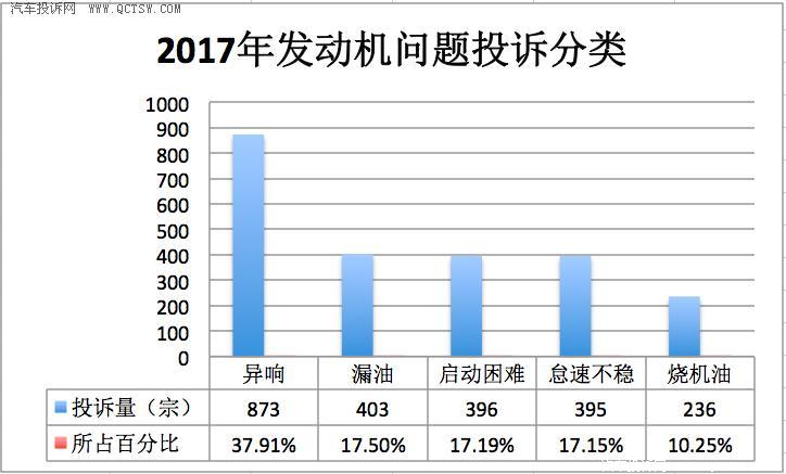 另外再来看看发动机投诉问题分类,其中异响以873宗,占比37.91%排名第一;而漏油以403宗,占比17.59%排名第二;而第三名则是启动困难,有396宗,占比17.19%;剩下的则为启动困难、烧机油。