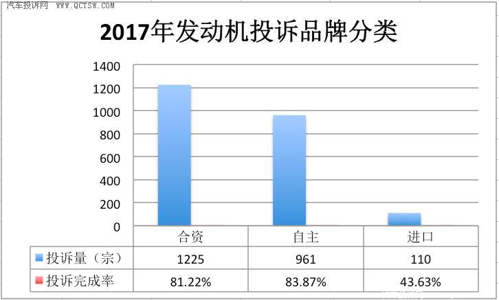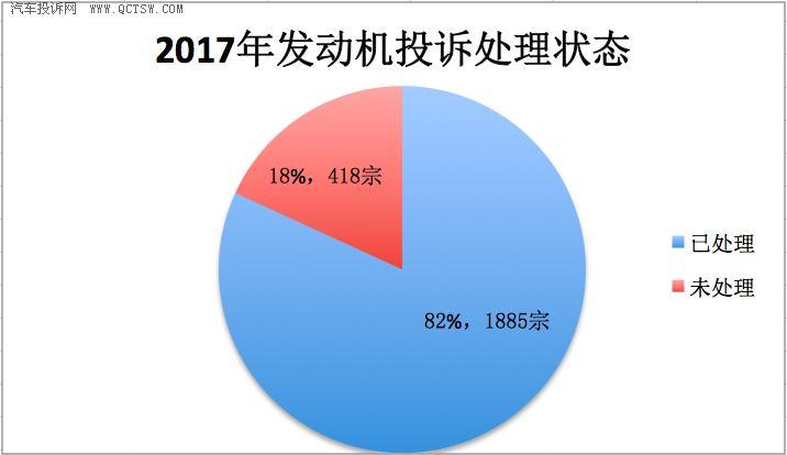 此外,在2303宗汽车发动机投诉案例中,有1885宗投诉已经处理完毕,占比82%;而未处理的案件有418宗,占比18%。在这数据中,我们也发现了投诉中还有418宗并未有处理,虽然处理率较2016年有所上升,但其实翻看数据不难发现,其中关于异响、漏油、烧机油等情况很可能已经是该汽车固有的现象,厂商并没有好的处理方法,为此也导致了未处理的情况出现,但这种行为也无异是加深消费者与其双方之间的矛盾。